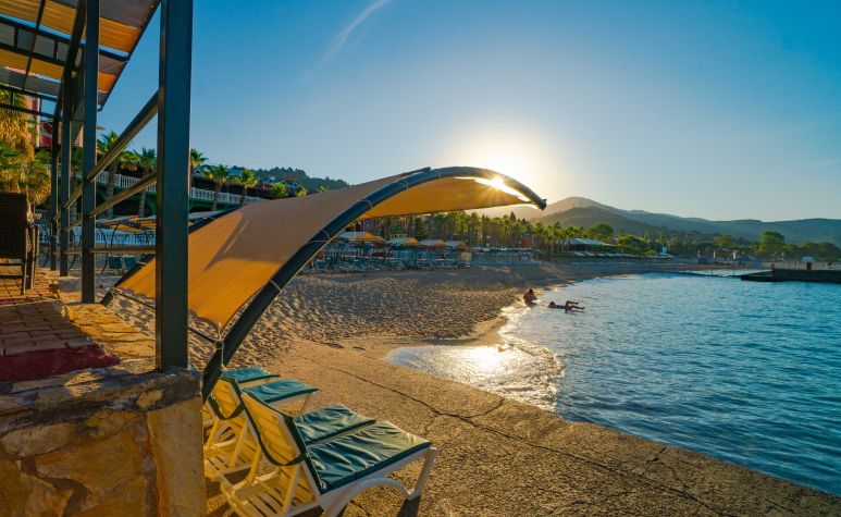 Собствен, пясъчно-чакълест, платформа. Чадъри, шезлонги и плажни кърпи на плажа и при басейна – безплатно.