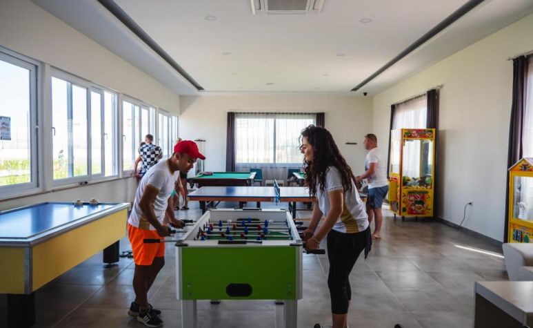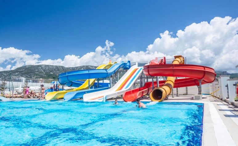 За децата: 2 открити детски басейна и 1 закрит, детска площадка, мини клуб (4-12 г), рисуване на лица, форми от балони, мини диско, детска анимация.