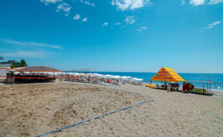 Собствен, пясъчно – чакълест на 150 м от хотела, чрез подлез.   Чадъри, шезлонги и плажни кърпи на плажа и при басейна – безплатно.