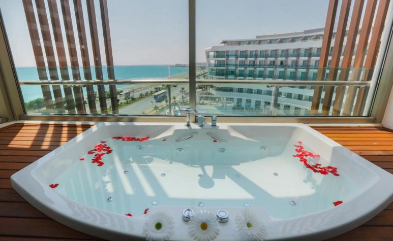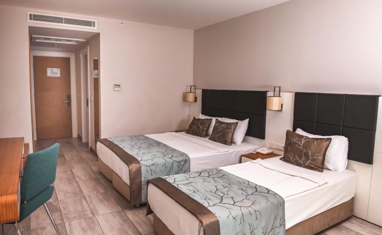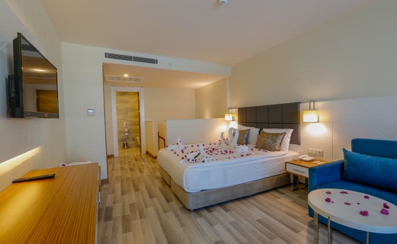 Стаи Main Building: 244 Hotel Standard sea view room (изглед море - 28 м2), Hotel Standard side sea view room (частичен изглед море - 28 м2), Hotel Standard land view room (изглед суша - 28 м2), 15 Dublex room (на 2 етажа - 2 спални, 2 бани, 1 диван - 56 м2), 7 Deluxe suite room (1 спалня, хол, 1 баня + джакузи - 57 м2), 4 Suite room (1 спалня + диван, 1 баня – 50 м2), 9 Large Standard room (32 м2).