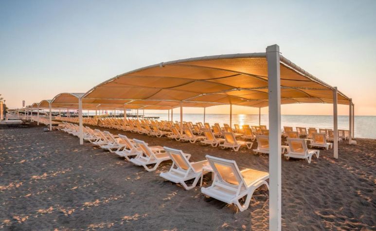 Собствен, чакълест. Чадъри, шезлонги, матраци и плажни кърпи на плажа и при басейна – безплатно.