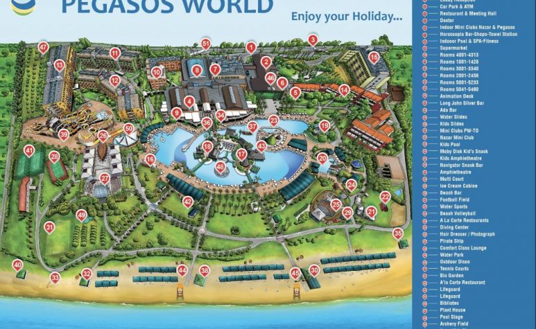 Хотел Pegasos World 4* се намира на 6 км от центъра на Сиде,на 5 км от центъра на Манавгат, на 60 км от центъра на Алания и на 70 км от летище Анталия. Построен през 2002 г, реновиран през 2018г.