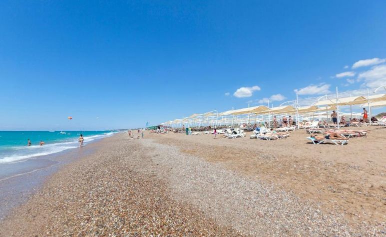 Собствен, пясъчно-чакълест плаж, на 500 м от хотела. Безплатен шатъл до плажа (по разписание). Чадъри, шезлонги, матраци и плажни кърпи на плажа и при басейна - безплатно. Душ, кабина за преобличане, спасител, бар на плажа.
