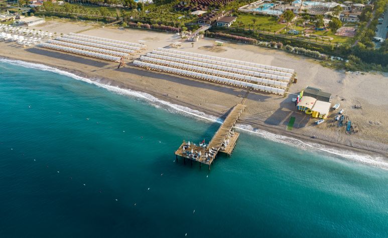 Собствен, пясъчен-чакълест, с дължина на плажната ивица 200 м. и кей. Чадъри, шезлонги и матраци на плажа и при басейна - безплатно.