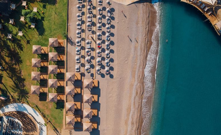 Собствен, пясъчно - чакълест. Чадъри, шезлонги и плажни кърпи на плажа и при басейна – безплатно.