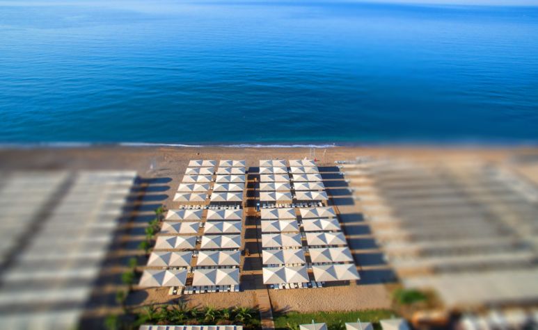 Собствен, пясъчен, на 300 м. от хотела. Безплатен шатъл до плажа (по разписание). Чадъри, шезлонги и плажни кърпи на плажа и при басейна - безплатно.