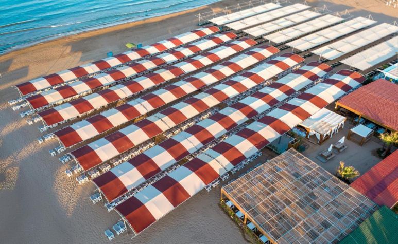 Собствен на 250м. от хотела, пясъчен. Чадъри, шезлонги и матраци на плажа и при басейна - безплатно.