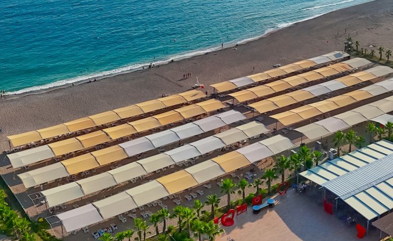 Собствен, пясъчно - чакълест. Чадъри, шезлонги и плажни кърпи на плажа и при басейна – безплатно.