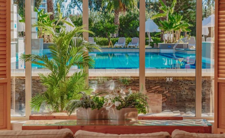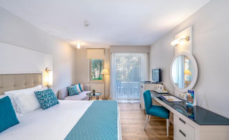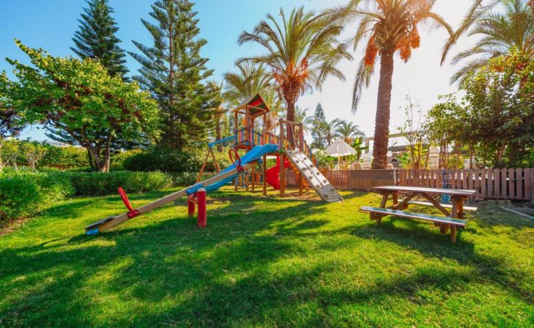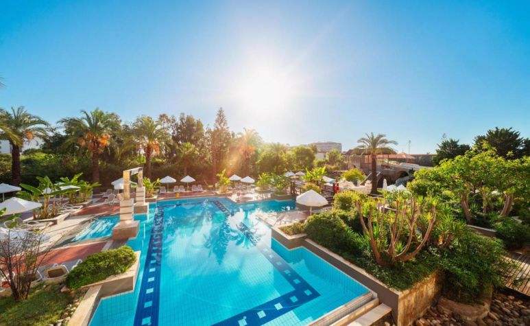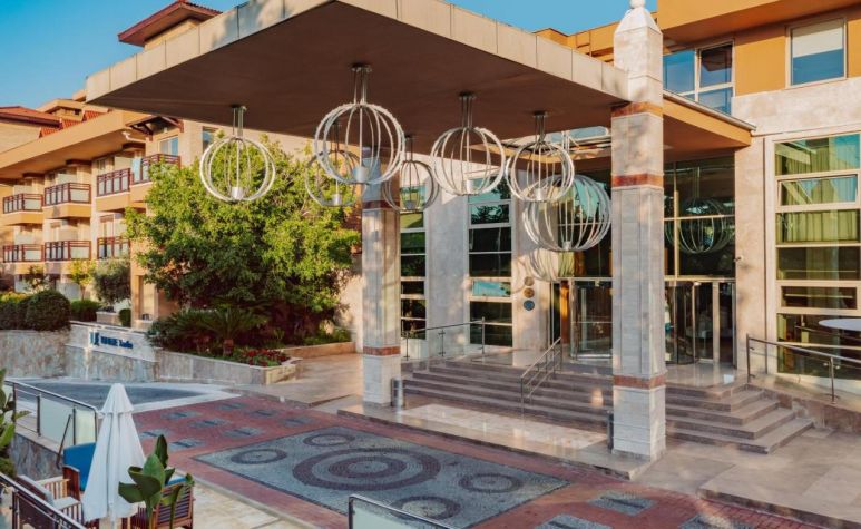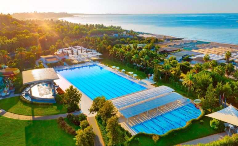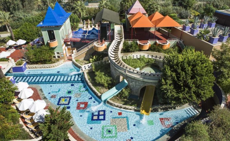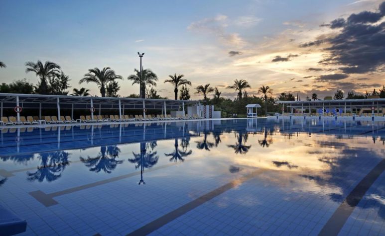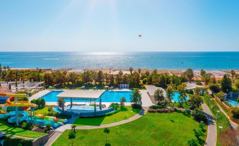 Основен ресторант, 3 A la carte ресторанта, 3 бара, 4 конферентни зали, 3 басейна (1 закрит и 2 открити), 3 водни пързалки, тенис на корт, салон за красота, СПА център, лекар, интернет в лобито на хотела (безплатно). Безплатни услуги: фитнес център, сауна, турска баня, тенис на корт, ракети за тенис, тенис на маса, билярд, дартс, шах, баскетбол, волейбол, плажен волейбол, кану, аеробика, мини голф, дискотека, анимация. Платени услуги: масаж, джакузи, солариум, езда, водни ски.