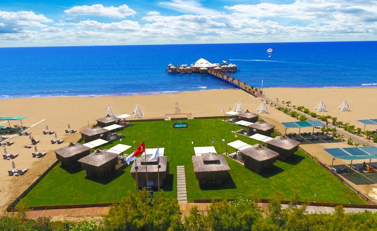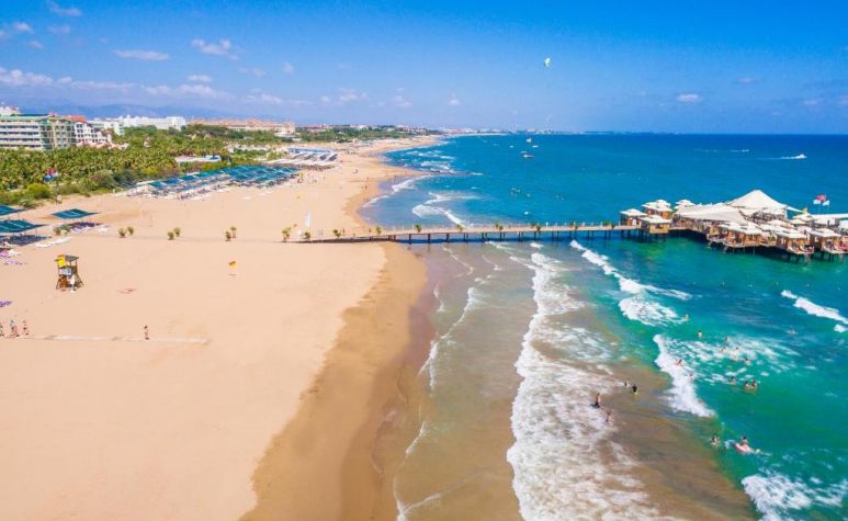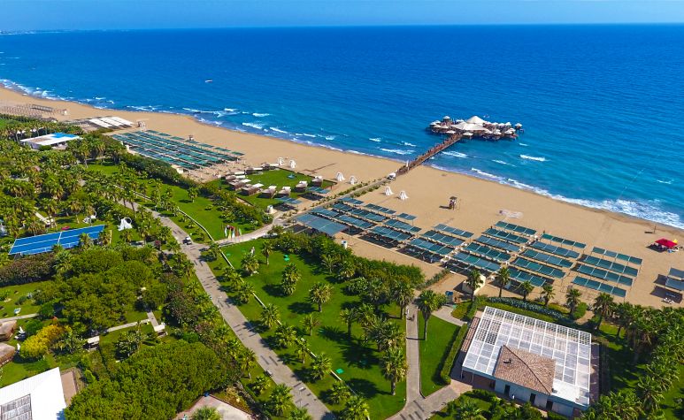 Собствен пясъчен плаж с дължина от 400 м. Плажът се намира на около 300 м от хотела, като може да се използва безплатен шатъл. Eдин от най-хубавите плажове в Анталия. Чадъри, шезлонги и плажни кърпи на плажа и при басейна - безплатно. Бар на плажа - безплатно.