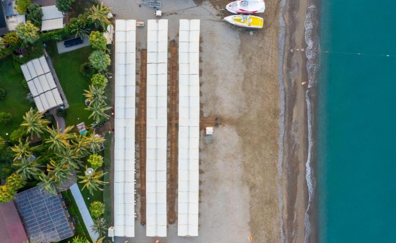 Собствен, пясъчно - чакълест. Чадъри, шезлонги и плажни кърпи на плажа и при басейна – безплатно.