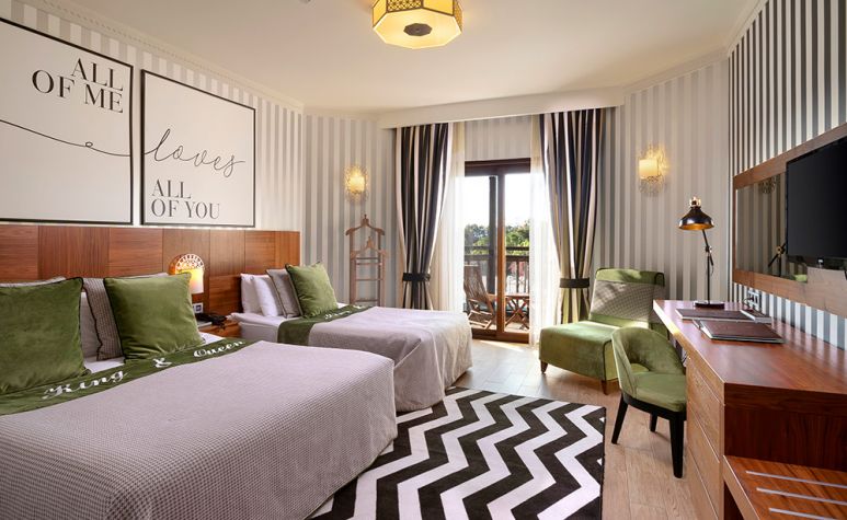 Хотелът разполага с общо 455 стаи, 278 разположени в 2 основни сгради Main building (4-6 етажа) и 177 стаи във сгради Nature (2 или 3 етажа), от които 192 Main Building Standard Room (17-25 м2), 50 Garden Room (някои от стаите не разполагат с балкон  - 17 м2), 177 Nature Room (25 м2), 14 Suite Room (спалня, дневна, кухненски бокс  - 50-53 м2), 22 Family Suite Room (2 отделни спални, дневна, кухненски бокс и трапезария  - 64 м2).