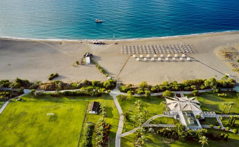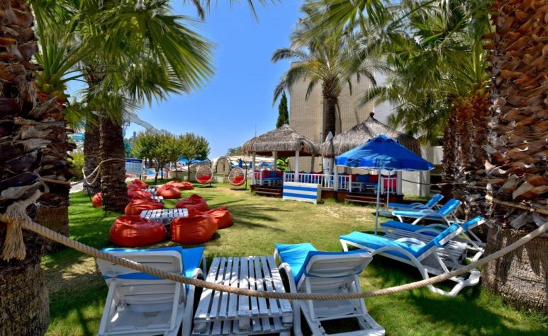 Собствен, широк пясъчен плаж, с дължина 400 м - удостоен със син флаг; с лек наклон; при влизане в морето има камъчeта. Безплатни плажни кърпи (с хавлиени карти в посочените часове). Шатрите на плажа - безплатни; шатрите край басейна се резервират и заплащат на рецепция предварително.