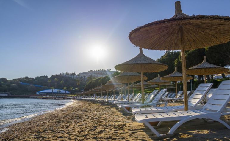 Собствен пясъчно- чакълест плаж с дължина от 700 м, и 3 платформи - чадъри, шезлонги и кърпи на плажа и при басейна - безплатно. VIP кабани на плажа срещу доп. заплащане и с предварителна резервация.