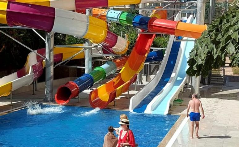 Основен ресторант, лоби бар, снек бар при басейна, 2 открити басейна, 4 водни пързалки, ТВ стая, 1 конферентна зала.