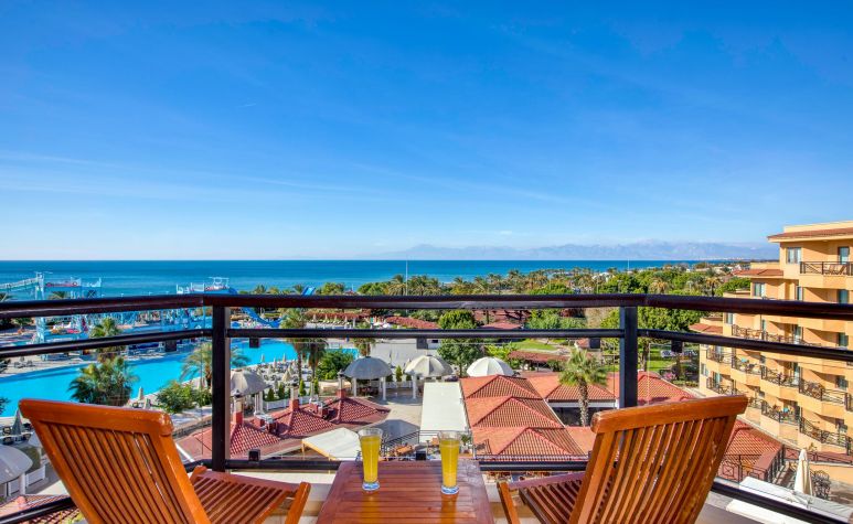 Aqua Family Suite room: 52 m2 стаите се състоят от голяма спалня и хол, разполагат с централен климатик, телевизор, сейф, сет за кафе и чай, електрическа кана,сешоар, баня и тоалетна, балкон.