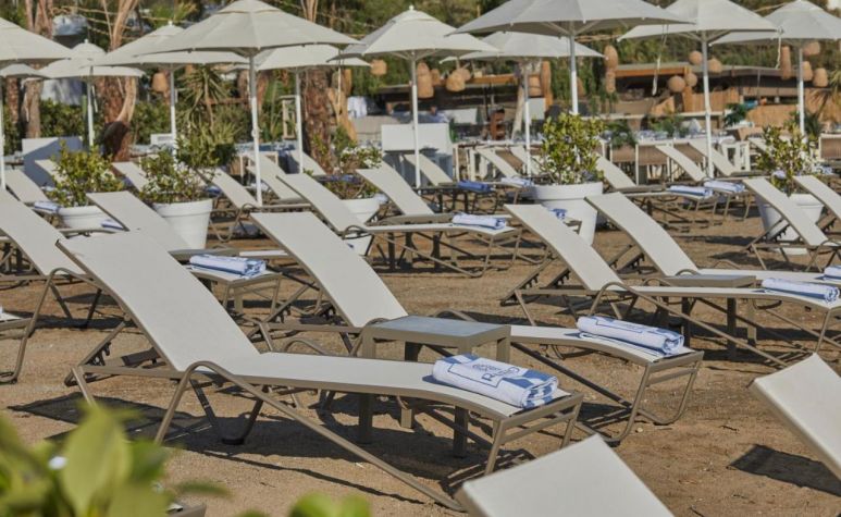 Собствен, пясъчно-чакълест. Чадъри и шезлонги на плажа и при басейна - безплатно.