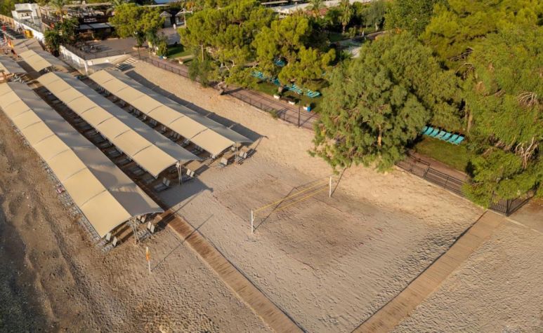 Собственият плаж с големи камъчета се намира срещу хотела, по подземен проход.