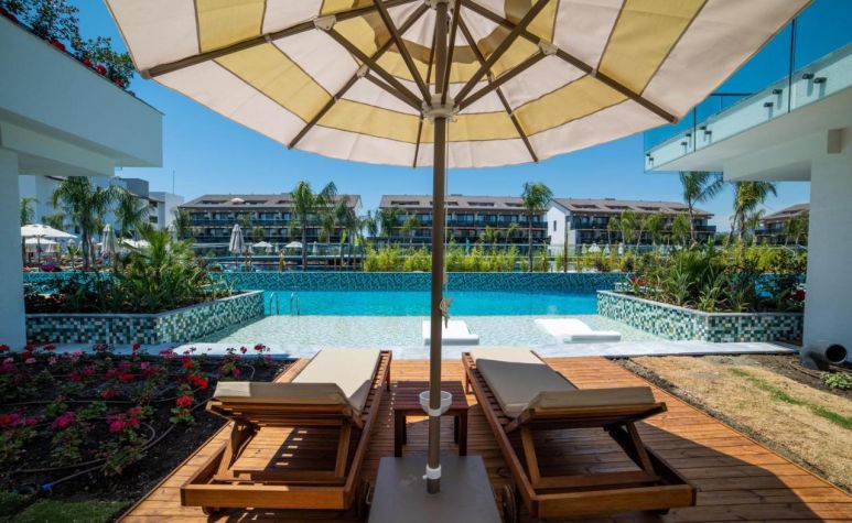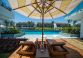 Lake House Swim-Up Suite (78 кв. м) – Стилен и модерен дизайн, директен достъп до басейна и шезлонги и чадъри за почивка.