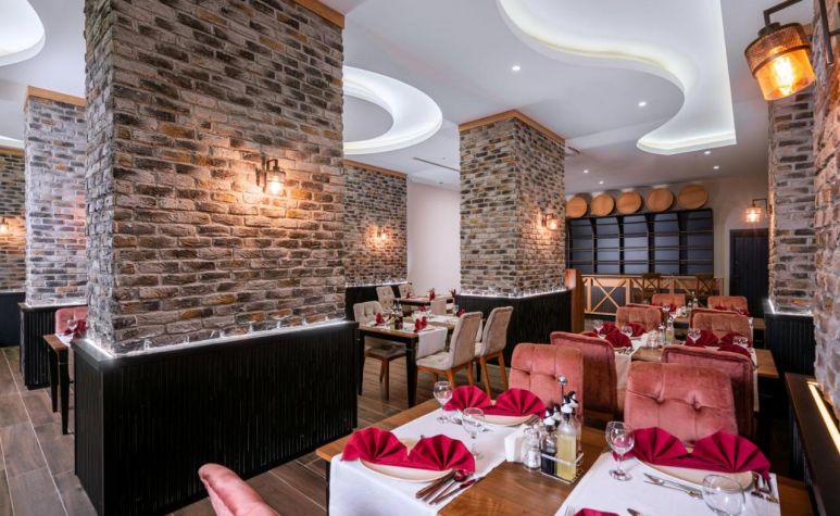Основен ресторант, а-ла-карт ресторант – интернационален (1 безплатно посещение минимум 7 нощувки), сладкарница, 3 бара, открит и закрит басейн, водни пързалки, СПА център.